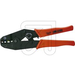 Presszange für lötfreie, elektrische Verbindungen, Einführung seitlich, Zwangsvollendung des Preßvorgangs durch Sperrvorrichtung, Entriegelung der Sperrvorrichtung durch Notlösehebel, gute Griffsicherheit durch Kunststoff-Griffschalen