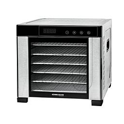 zum Trocknen von Obst, Gemüse, Kräutern, Fleisch, Fisch und mehr, doppelwandiges Edelstahl Gehäuse mit Touch Control Sensoren und LED-Display, elektronisch gesteuerte Temperaturregelung von 35 °C bis 75 ° mit Überhitzungsschutz, 24 Stunden Zeitschaltuhr mit automatischer Abschaltfunktion und Signalton, inklusive 6 Edelstahl Dörrtabletts 300x315 mm, 1 Dörrgitter und 1 Dörrmatte